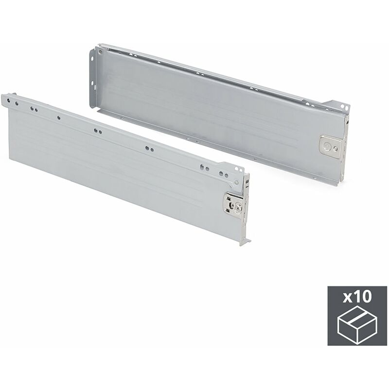 Kit Cassetto Per Cucina Ultrabox A 150 mm P 400 mm Acciaio Grigio Metallizzato 10 Pezzi Emuca Il kit per cassetto da cucina e bagno Ultrabox è composto da profili lateriali in acciaio con guide a rotella, progettate con finiture verniciate in alluminio . È la migliore opzione con il miglior rapporto qualità -prezzo per cassetti da cucina e bagno. Ogni kit include tutti gli accesori per il montaggio di un cassetto: profili laterali, set di guide con caduta e agganci anteriori per il frontalino . Necessita di pannelli tagliati a misura per il fondo e la schiena oltre al frontalino del cassetto. Gli aggangi di fissaggio del frontalino permettono la regolazione eccentrica ± 2 mm verticale. Questi agganci sono già montati sul lato della sponda in acciaio. Cassetto di acciaio composto da due lati e guide a rullo e chiusura a caduta. Altezza del profilo 150 mm e profondità 400 mm. Il fondo non necessita di lavorazioni. capacità di fissaggio migliorata dall'aggancio sul profilo. Si serve di