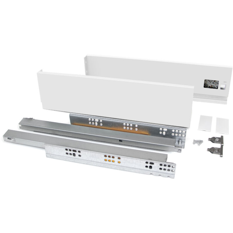 Cassetto Esterno Vertex 40 Kg A 93 mm P 350 Verniciato Bianco Acciaio Emuca Kit per cassetto cucina e bagno Vertex con tutti gli elementi necessari per il suo assemblaggio.È la soluzione ottimale per i mobili della tua cucina, bagno o armadio con un design elegante in colore grigio antracite e bianco . Ogni kit è composto da tutti gli elementi necessari per il montaggio di un cassetto esterno di 93 mm di altezza in moduli con uno spessore laterale di 16 mm . Include: due sponde laterale, un set di guide con chiusura soft, un set di coperchi di rivestimento e i fissaggi per la parte anteriore del cassetto. Le sponde laterale in metallo sono realizzate in acciaio con finitura verniciata grigio antracite e bianco, consentono di regolare la parte anteriore del cassetto ± 2mm in verticale e ± 1mm in orizzontale . Le guide sono di estrazione totale con chiusura ammortizzata e hanno una capacità di carico massima di 40 Kg per il cassetto. Avrà solo bisogno dei pannelli tagliati della