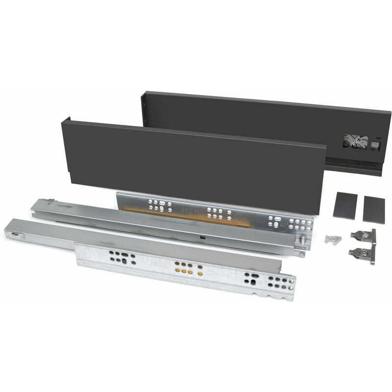 Cassetto Esterno Vertex 40 Kg A 93 mm P 550 Grigio Antracite Acciaio Emuca Kit per cassetto cucina e bagno Vertex con tutti gli elementi necessari per il suo assemblaggio.È la soluzione ottimale per i mobili della tua cucina, bagno o armadio con un design elegante in colore grigio antracite e bianco . Ogni kit è composto da tutti gli elementi necessari per il montaggio di un cassetto esterno di 93 mm di altezza in moduli con uno spessore laterale di 16 mm . Include: due sponde laterale, un set di guide con chiusura soft, un set di coperchi di rivestimento e i fissaggi per la parte anteriore del cassetto. Le sponde laterale in metallo sono realizzate in acciaio con finitura verniciata grigio antracite e bianco, consentono di regolare la parte anteriore del cassetto ± 2mm in verticale e ± 1mm in orizzontale . Le guide sono di estrazione totale con chiusura ammortizzata e hanno una capacità di carico massima di 40 Kg per il cassetto. Avrà solo bisogno dei pannelli tagliati della