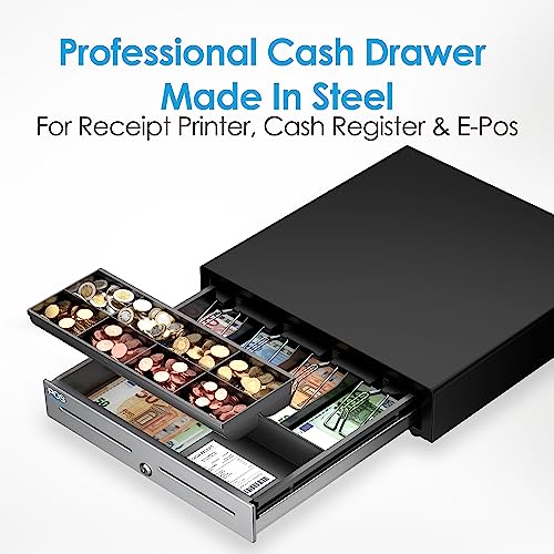 Cassetto in Ferro Cassa Portasoldi per Stampante Fiscale RT e Registratore di Cassa. Interno 4 Banconote / 8 Monete (euro) - Nero/Inox, Automatico, Struttura in Acciaio - 41x41x11cm - POS VALLEY