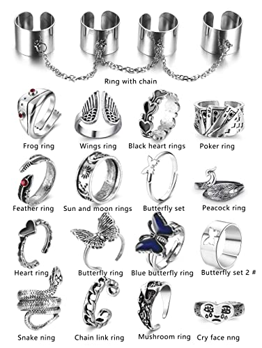 CASSIECA 20 PCS Argento Regolabile Anelli Aperti Set Ansia Anello Farfalla Coppia Anelli Goth Anelli Abbraccio Serpente Anello Vintage Impilabili Anelli Y4K Anello Set per Donne Uomini Ragazze