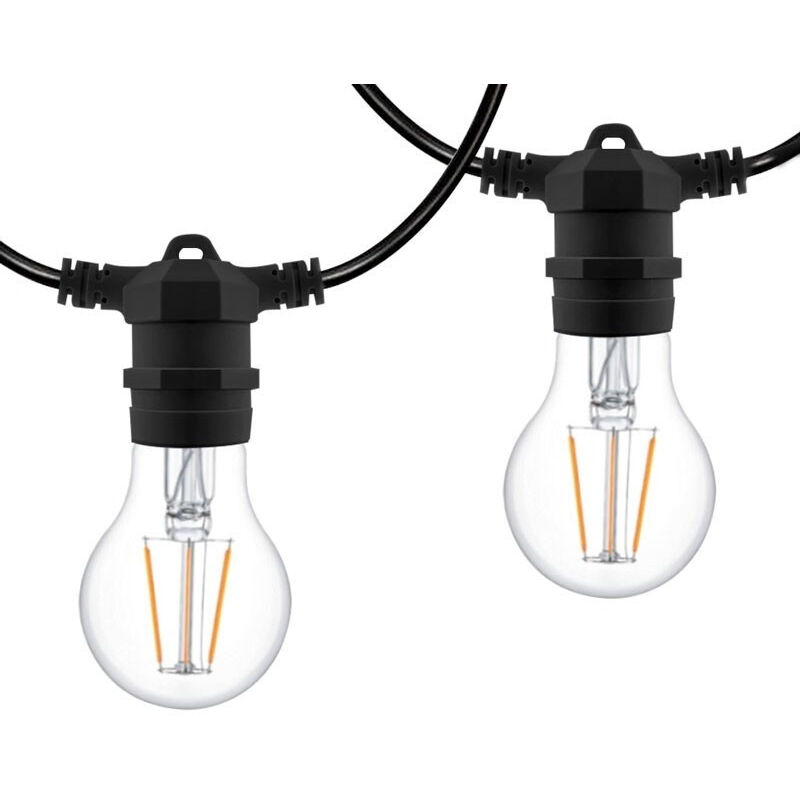 Ghirlanda decorativa per esterni lunga 10 metri con 10 portalampada E27. Ha un grado di protezione IP44, che la rende adatta all'uso esterno, senza esposizione diretta alla pioggia. È dotata di connettori alle estremità che consentono di unire in serie altre unità, e include una spina europea. Disponibile in 4 colori per un'illuminazione decorativa da esterno personalizzata. **Le lampadine non sono incluse**