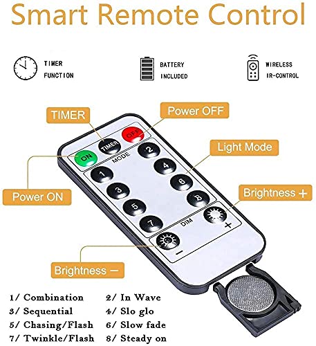 8 modalità di illuminazione: catena di luci a fiocco di neve con combinazione, onde, sequenziale, slo-glo, shasing / flash, lenta dissolvenza, flash, flash e modalità di illuminazione fissa. È possibile impostare qualsiasi modalità.