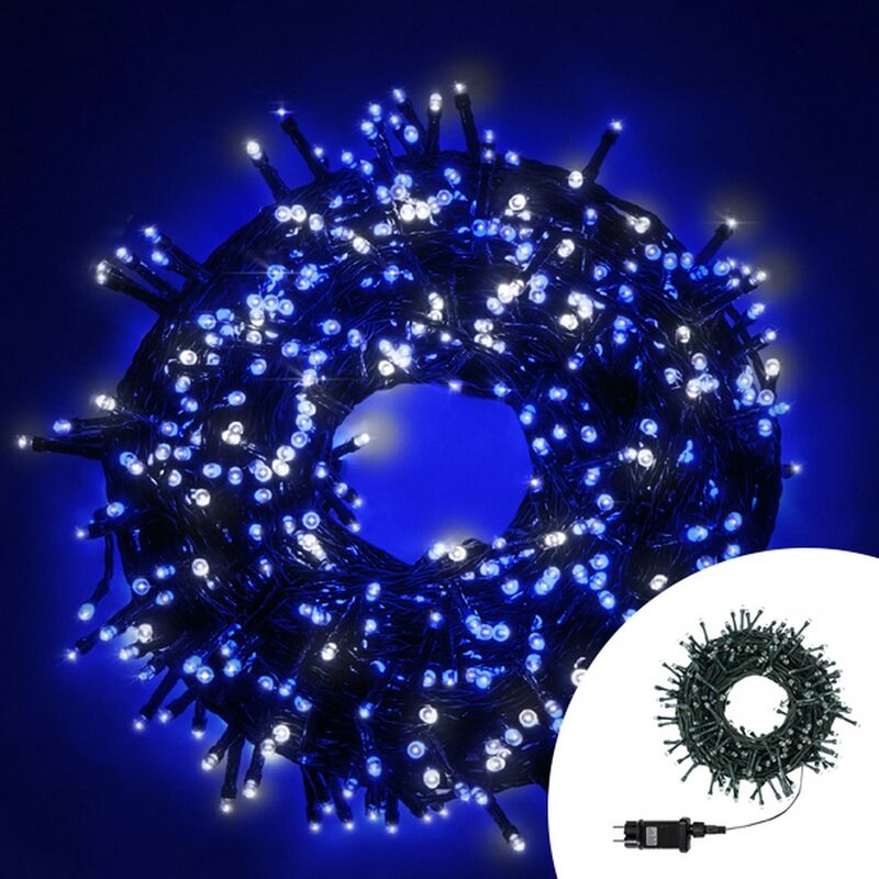 Minilucciole a Led per albero di Natale, presepe e decorazioni natalizie, filo di colore verde, 500 Miniled diametro 5mm Reflex distanti 5 cm l'uno dall'altro, Temperatura Colore 250 Led Bianco Freddo e 250 Led Blu, controller con 8 giochi di luci, lunghezza 25 metri, distanza spina - luci 3 metri, voltaggio 31V con trasformatore per il collegamento alla rete elettrica 220V-240V, adatta per uso interno con possibilità di uso esterno solo se il controller e la spina non sono direttamente esposti ad agenti atmosferici.