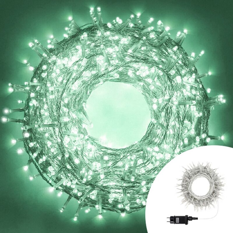 Minilucciole a Led per albero di Natale, presepe e decorazioni natalizie, filo trasparente, 500 Miniled diametro 5mm Reflex distanti 5 cm l'uno dall'altro, Colore Verde Acqua, controller con 8 giochi di luci, lunghezza 25 metri, distanza spina - luci 3 metri, voltaggio 31V con trasformatore per il collegamento alla rete elettrica 220V-240V, adatta per uso interno con possibilità di uso esterno solo se il controller e la spina non sono direttamente esposti ad agenti atmosferici.