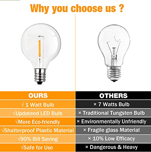 [Connessione end-to-end] La catena leggera per esterni è dotata di 16 lampadine in PET (1 pezzi di ricambio) e 15 prese E12, la lunghezza totale è 30FT/9.1M, che può essere in base alle tue esigenze in diverse occasioni, puoi mettere dove ti serve ovunque. Queste stringhe di luce sferica G40 supportano connessioni end-to-end fino a 33 fili (fino a 400 watt).