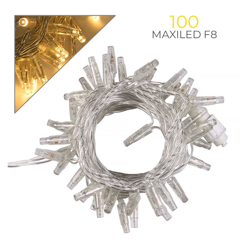 CATENA LUMINOSA PROFESSIONALE 100 MAXI LED EFFETTO CIELO STELLATO LUCE CALDA IDEALE PER ILLUMINAZIONE DECORATIVA ESTERNA PROLUNGABILE La catena luminosa professionale con 100 maxi-led reflex F8 è un prodotto studiato per offrire un'illuminazione decorativa di grande impatto visivo e durata, perfetta per ogni tipo di occasione all'aperto. Combinando la luce gialla fissa con la bianca intermittente, crea un ambiente vivace e accogliente, rendendola adatta per eventi speciali, feste in giardino, matrimoni o semplicemente per aggiungere un tocco di magia all'illuminazione quotidiana degli esterni. La catena, lunga 10 metri, può essere estesa fino a 10 unità in totale, fornendo un'opzione flessibile e versatile per coprire ampie superfici e creare splendide scenografie luminose. I maxi-led reflex F8 sono posizionati a intervalli regolari di 10 cm lungo il cavo trasparente, garantendo un'illuminazione uniforme e piacevole. Il cavo trasparente si adatta con facilità a qualsiasi stile