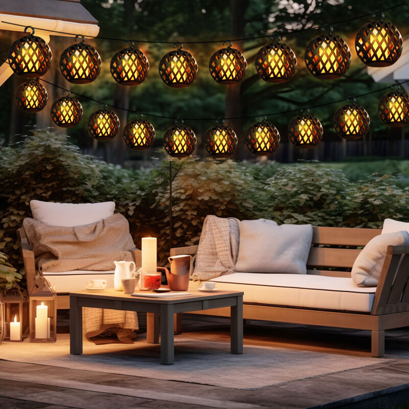 Descrizione Queste lucine solari con sfere di plastica nere sono una bellissima aggiunta al tuo giardino, patio o balcone. Grazie al grado di protezione IP44, potrai posizionare questa catena di luci all'aperto senza alcuna preoccupazione. Otto luci (diametro 8 cm ciascuna) più il cavo hanno una lunghezza totale di 2 metri. Le lampadine cilindriche a LED bianche all'interno delle lanterne sono alimentate ad energia solare (colore della luce 2500 Kelvin) e donano al vostro spazio esterno una piacevole atmosfera come a lume di candela. Le lampadine a LED sono installate in modo permanente nelle luci. La fornitura comprende tre lucine, ciascuna con otto palline. Lampada dettagli • Tipo di lampada: lucine solari • Materiale: plastica • Colore nero • Effetto fuoco • 8 palline • Interruttore • Tempo di illuminazione: 6-8 ore • Batteria: 1x AA, 400 mAh, Ni-Mh, 1,2 V • Grado di protezione: IP44 • Distanza 20 cm • Diametro x lunghezza in cm: 8x200 • Sorgente luminosa: 8x LED • Lampadine