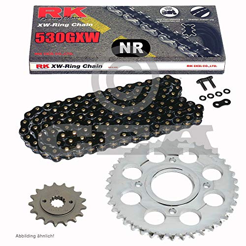 Set per catena della confezione: RK bl53 0gxw XW anello catena aperta in nero con hohlniets chloss e 106 rotoli, adatto per moto da strada fino a 1400 CCM e motociclette fino a 900 CCM, resistenza alla trazione 4490 kg, per catena moto hochpraezis realizzato in acciaio C45 High Carbon, catena pignone in acciaio legato al cromo scm415 realizzato CNC, traduzione 19/42