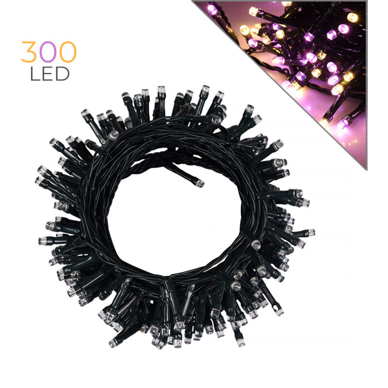 CATENA NATALIZIA 300 LED LUCE ROSA E GIALLA 15 METRI FILO VERDE - PER INTERNI ED ESTERNI IP44 La Catena Natalizia 300 LED è l'accessorio perfetto per creare un'atmosfera festiva e accogliente sia all'interno che all'esterno della tua casa. Con una lunghezza di 15 metri, questa catena luminosa è dotata di LED a luce gialla e rosa, che conferiscono un tocco di eleganza e originalità alle tue decorazioni natalizie. Il cavo verde si integra perfettamente con l'ambiente circostante, sia che tu voglia decorare un albero di Natale, un giardino, una veranda o una vetrina. Vantaggi e Caratteristiche: Versatilità d'Uso: La catena è progettata per essere utilizzata sia all'interno che all'esterno, grazie al grado di protezione IP44, che garantisce resistenza agli spruzzi d'acqua e alla polvere. Puoi quindi decorare senza preoccupazioni giardini, gazebi, terrazze, oltre a interni come salotti, vetrine e altri spazi commerciali. Efficienza Energetica: Il trasformatore a bassa tensione da 31V