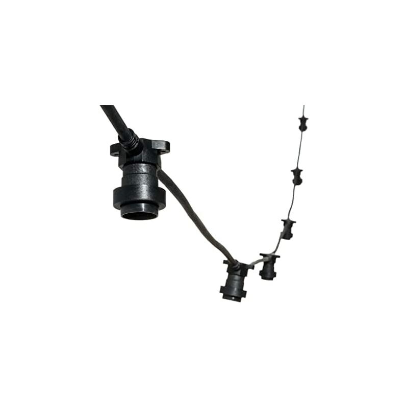Cordoniera per luci (IP65) Connettibile (Max 10 pezzi) Cordoniera luminosa E27 di colore nero IP65 per uso esterno ed interno, lunga 15 metri, è formata da 21 portalampada E27 posizionati 1 ogni 50 centimetri in maniera lineare. La cordoniera è utile per illuminare e donare una atmosfera speciale a giardini, verande, portici, gazebi in tutte le occasioni, lampadine E27 non incluse, è possibile collegare in serie fino a 4 cordoniere tramite il connettore impermeabile incluso sfruttando una sola spina di alimentazione. Caratteristiche Tecniche: Lunghezza Cavo: 15 m.;