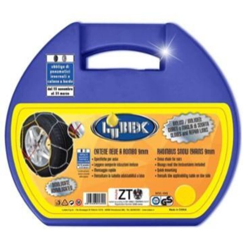 Con dispositivo di tensione laterale elastico che evita vibrazioni eccessive, garantendo sicurezza durante in viaggio. Prodotte in acciaio speciale galvanizzato con battistrada a rombo, assicurano una grande aderenza. Misura 9 mm.