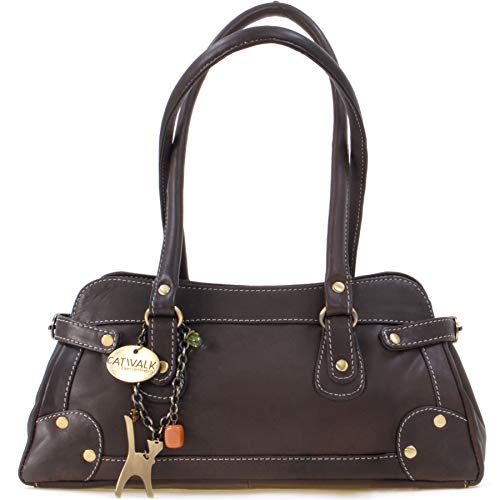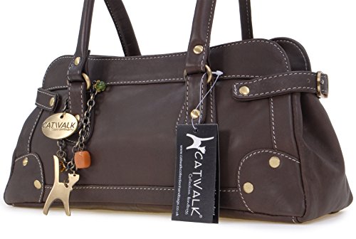 Catwalk Collection Handbags - Vera Pelle - Borsa a Spalla/Borse a Mano con manico corto - Con Ciondolo a Forma di Gatto - Carnaby - MARRONE SCURO