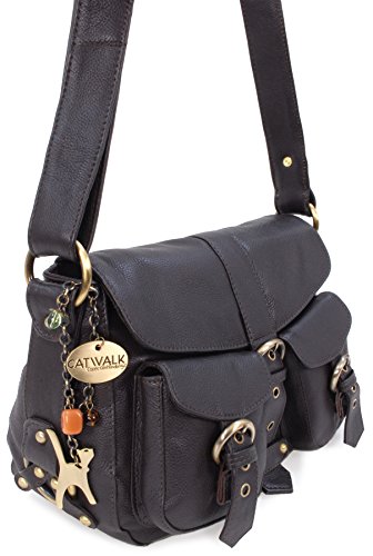 Catwalk Collection Handbags - Vera Pelle - Borse a Tracolla/Borsa a Mano/Messenger/Borsetta Donna - Con Ciondolo a Forma di Gatto - Louisa - MARRONE SCURO