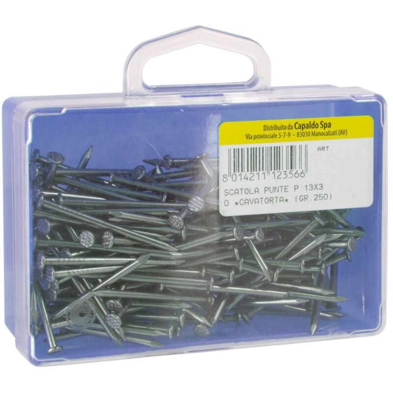 Punte in soluzione 'fai da te', confezionate in pratiche scatoline appendibili di plastica, rivolte al settore professionale e bricolage. Punte prodotte con acciaio a basso (0,05-0,06%) e a medio tenore di carbonio (media 0,65%).. Prezzo inteso per: 1 CF