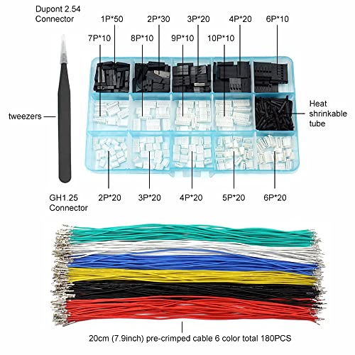 Inclusi cavi GH1.25 a Dupont2.54 pre-crimpati da 20 cm x 180 pezzi (6 colori, 30 cavi per ogni colore), connettori GH1.25 e Dupont2.54, diametro 1 mm tubo termorestringente * 100 pezzi e 1 pinzetta