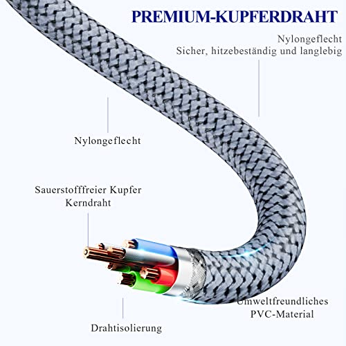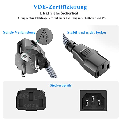 Cavo di alimentazione a 3 poli, per dispositivi a freddo, 5 m, in nylon, cavo di alimentazione universale (CEE 7/7 su IEC60320 C13) con VDE per monitor, PC, stampanti, PS3/PS4