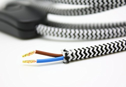Cavo di alimentazione in tessuto con spina e interruttore, lunghezza 1,9 m, a 2 poli, diversi colori, Hanna's Laden Schwarz-weiß/Schwarz