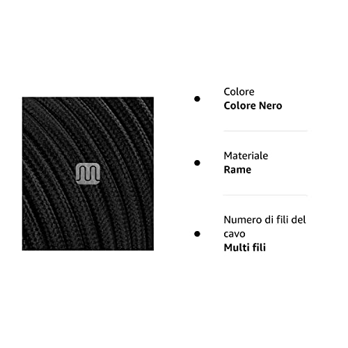 Cavo elettrico tondo rivestito in tessuto colorato per lampadari, lampade, abat jour. Il cavo elettrico diventa design! Scegli fra 30 colori. 10 Metri 2x0,75. Made in Italy! Nero