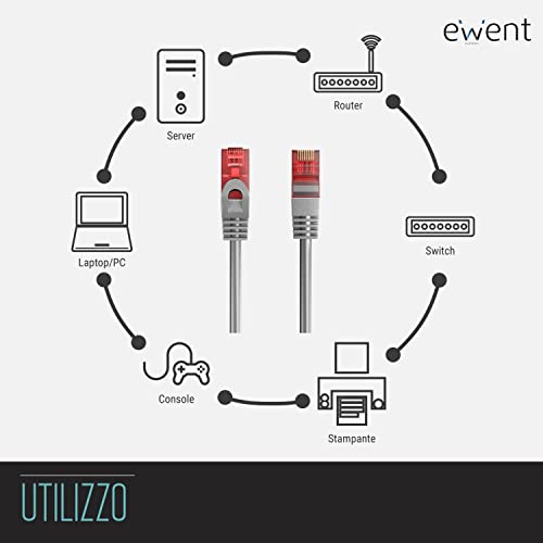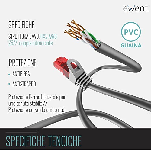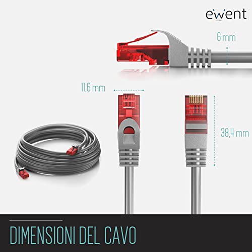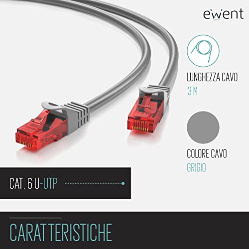 Cavo Ethernet di Rete Patch CAT 6 U/UTP, trasmissione fino a 1Gigabit, AWG 26/7, 2 Connettori RJ45. Ideale per trasmissione fibra ottica con regi Gigabit/LAN, 3m, Grigio
