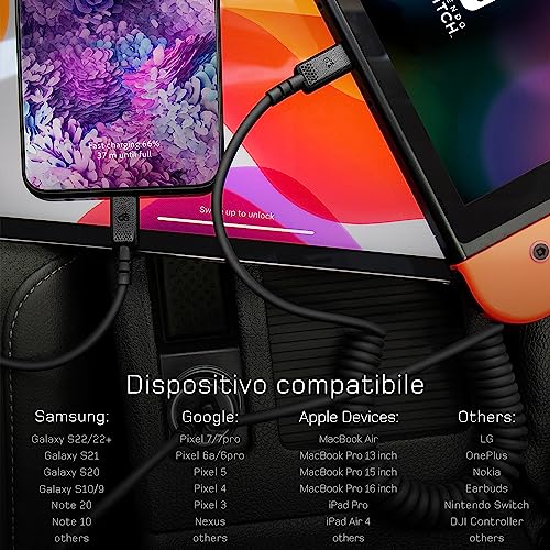 Dé Cavo Lightning a Spirale 0,9m USB-C a USB-C 60 W & Android Auto per Samsung S22/S21/21/10 Note 20/10 MacBook Air/Pro iPad Pro Switch Google Pixel e Altri Dispositivi di Tipo C
