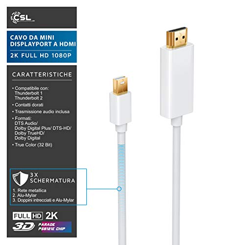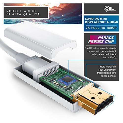 CSL - Cavo Mini Displayport HDMI da 5 Metri - 2K - Certificato - Connettori Dorati - Compatibile con PC e Apple Mac MacBook PRO MacBook Air - Bianco