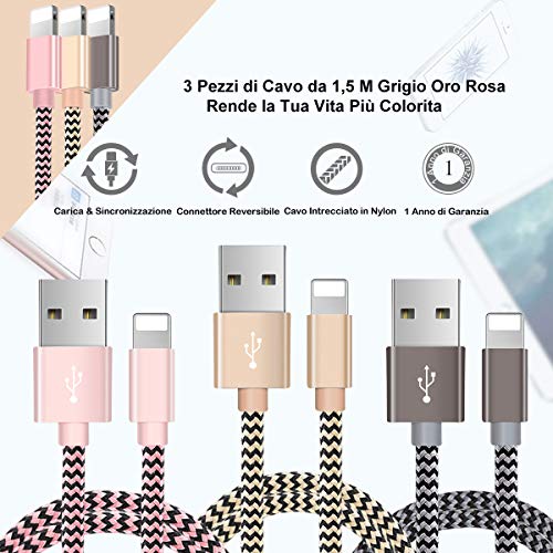 Cavo USB Phone Cavo di ricarica compatibile con il cellulare 3 pezzi Cavo di ricarica 1,5 m Cavo di ricarica in nylon intrecciato compatibile cellulare X/8/8Plus/7/7Plus/6/6Plus/Pad(Grigio oro rosa)