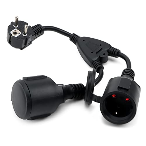 ✅【Materiale di alta qualità】 La presa a 2 vie è realizzata in PVC e gomma di alta qualità. L'uso di rame di alta qualità come conduttore riduce il consumo quando si utilizzano apparecchiature elettriche. La spina e il cavo di alimentazione hanno superato la certificazione VDE e la spina del terminale ha superato la certificazione CE e GS. Le prese Schuko hanno una copertura impermeabile per proteggere il cavo da oggetti estranei e spruzzi d'acqua. Puoi usarlo in totale sicurezza.