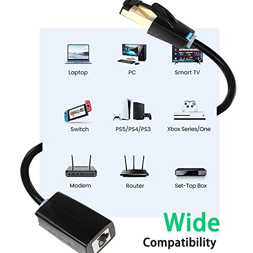 Il cavo di prolunga Ethernet Cat8 estende la connessione Ethernet esistente, adatto a tutte le configurazioni jack RJ45, può essere perfettamente compatibile con computer, laptop, modem, router, switch di rete, adattatori di rete, hub, PS5, PS4, PS3, X-Box 360, X-Box One e altri dispositivi di rete. Può anche essere completamente compatibile con Cat6e, Cat6, Cat5e, Cat5.