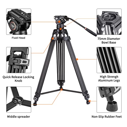 Cayer BF30L Treppiede video con testa fluida, treppiede resistente da 73" con testa fluida a 360 gradi e piastra a sgancio rapido per DSLR, videocamere, fotocamere, carico di gioco di 17,6 LB