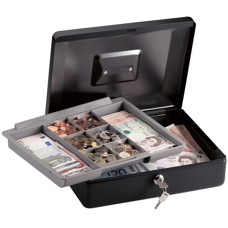 Il cassetto porta denaro da Master Lock è consegnato con un vassoio rimovibile con 8 compartimenti, per aiutarti a tenere in ordine le monete. E' realizzato in acciaio solido, per aggiungere sicurezza. Il cassetto è consegnato con 2 chiavi. Ha un manico incorporato per facilitare il trasporto. Dimensioni esterne: 9,3 x 30 x 23,5 cm (L x L x P) Dimensioni interne: 8,7 x 29,7 x 22,9 cm (L x L x P) Volume interno: 5,91 L Colore: Nero Materiale: Acciaio solido Include 2 chiavi e un vassoio rimovibile per monete con 8 scomparti SKU: 403274