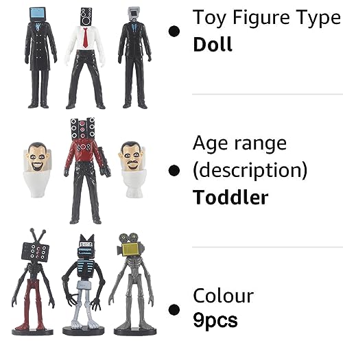 【Figura della toilette-Skibidi】: 9 pezzi La figura della toilette-Skibidi è squisitamente realizzata a mano, con squisite sculture facciali e costumi, sguardi seducenti e posture realistiche che ispirano la tua immaginazione. Vivido ed energico. Perfetto per la visualizzazione e la raccolta desktop.