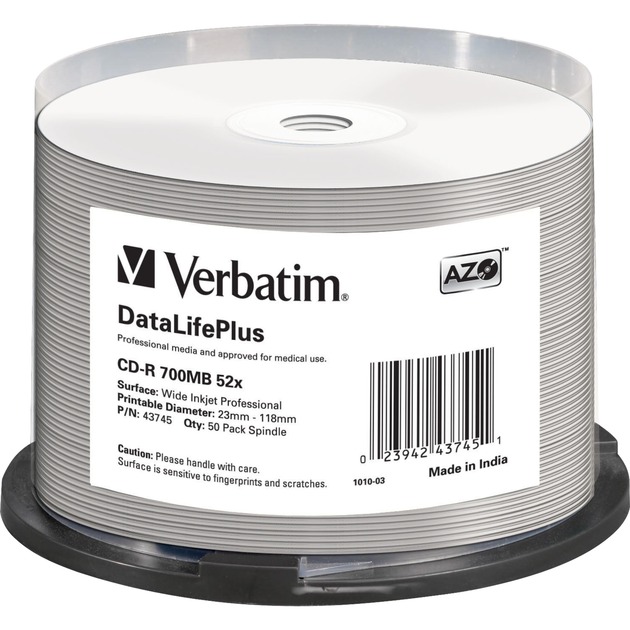 DataLifePlus I supporti ottici professionali di Verbatim presentano specifiche più rigorose rispetto agli standard forniti dagli organismi di standardizzazione competenti. Specifiche più severe garantiscono una migliore compatibilità con masterizzatori e registratori. Ciò si traduce in una maggiore qualità di registrazione, garantendo in tal modo una maggiore durata di archiviazione e una migliore leggibilità. Si possono riconoscere i supporti ottici professionali di Verbatim grazie al marchio DataLifePlus. Tecnologia AZO AZO è una tecnologia brevettata utilizzata esclusivamente da Verbatim. Assicura la massima resistenza alla luce UV conferendo una maggiore protezione e affidabilità. Personalizza il tuo disco - Wide Printable I dischi stampabili di Verbatim sono dotati di una superficie di stampa progettata per essere utilizzata con la stampante a getto d'