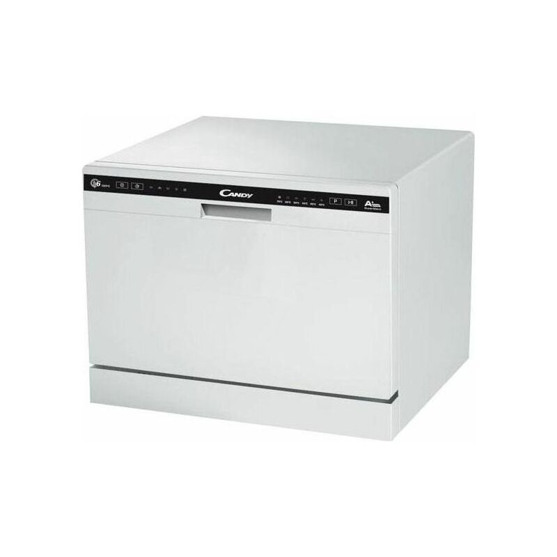 Candy CDCP 6/E. Posizionamento dell'apparecchio: Libera installazione, Dimensione: Compatta, Colore della porta: Bianco. Numero di coperti: 6 coperti, Emissione acustica: 51 dB, Programmi speciali: Vetro/Delicati, Rapido. Consumo di acqua per ciclo: 6,5 L, Consumo di energia per ciclo: 0,62 kWh, Carico di collegamento: 2150 W. Larghezza: 550 mm, Profondità: 500 mm, Altezza: 438 mm. Classe efficacia di asciugatura: A, Consumo energetico annuo: 174 kWh, Consumo d'acqua totale annuo: 1960 L