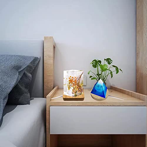 Combinazione perfetta: ci sono 2 stampi in cristallo di diverse forme e 3 base leggera USB in legno, tra cui stampo quadrato in silicone, stampo in silicone cristallo piramidale, base quadrata di luce di colore caldo, base rotonda luce di colore caldo, base rotonda luce colorata. Sufficiente per soddisfare le vostre esigenze creative.
