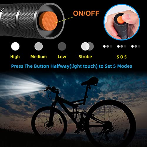 Resistente all'acqua & messa a fuoco regolabile: la torcia a LED luminosa è costruita con IP65 impermeabile, puoi smettere di preoccuparti del tempo imprevisto. Non importa dove tu vada, la migliore torcia per il campeggio, l'escursionismo, le situazioni di emergenza. La funzione di zoom regolabile consente di selezionare la messa a fuoco tra i fasci spot e flood ruotando la testa della torcia. Sei in grado di rendere il campo visivo molto ampio o in basso fino al punto di fronte a te.