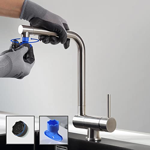 ✅ Materiali di Qualità: il raffinato rubinetto cucina è realizzato in acciaio inox 304 di alta qualità, estremamente robusto e resistente ai danni. La superficie in metallo spazzolato del miscelatore cucina è resistente alle impronte digitali e ai graffi. Per la vostra salute, tutti i componenti trattati sono privi di contaminanti e odori.