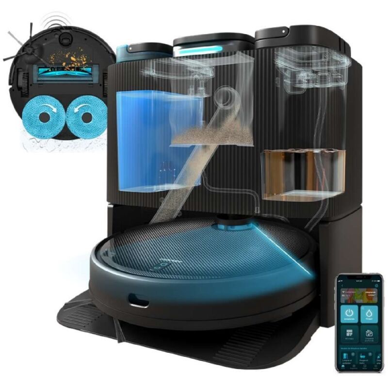 Robot aspirapolvere Conga 11090 Spin Revolution Home&Wash T. Base 4 in 1 (autosvuotamento del serbatoio di raccolta e pulizia dei panni). Tecnologia laser integrata. Spazzola multifunzione. Panni girevoli. Spazzola laterale. Motore di aspirazione da 5000 Pa. Controllo via app e assistenti virtuali.