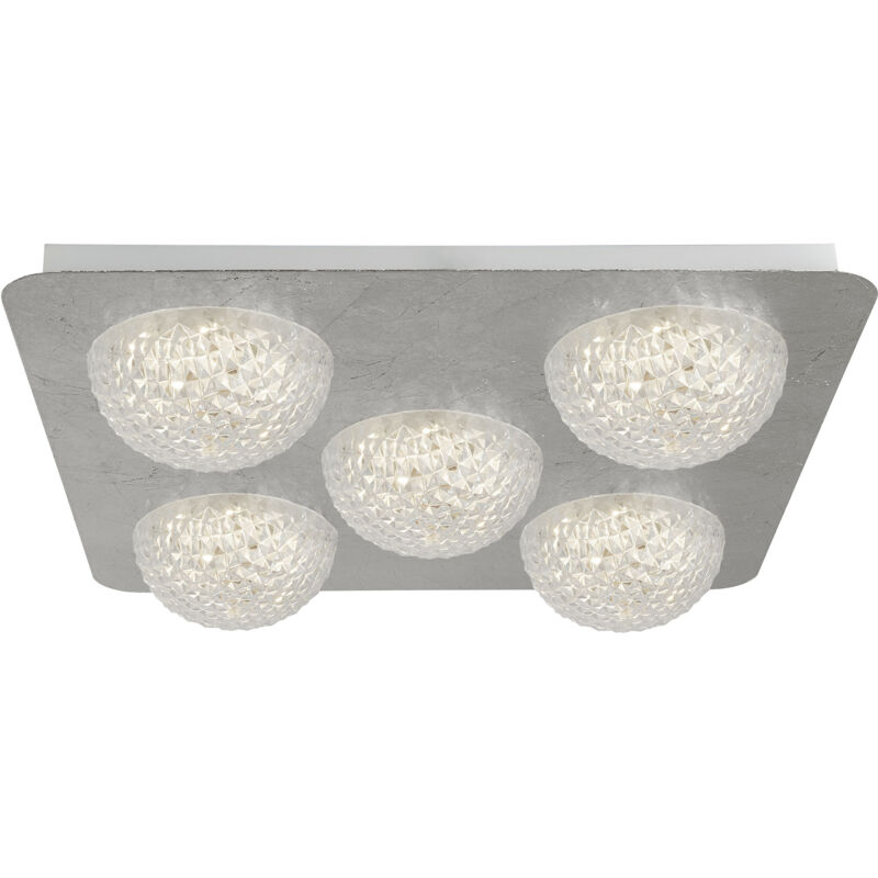 Collezione Celestia SPLENDORE MODERNO Una lampada da incasso unica e moderna, Celestia presenta una base in metallo rifinita in una splendida foglia argento e le 5 semisfere in acrilico trasparente. Hanno un grazioso design in cristallo tagliato che proietta la luce dal LED integrato in un caldo bagliore a motivi bianchi. Ideale per ingressi, soggiorni e portici con soffitti bassi, può essere controllato anche con un dimmer. I LED consumano fino al 75% di energia in meno e durano fino a 20 volte di più rispetto alle lampadine a incandescenza.