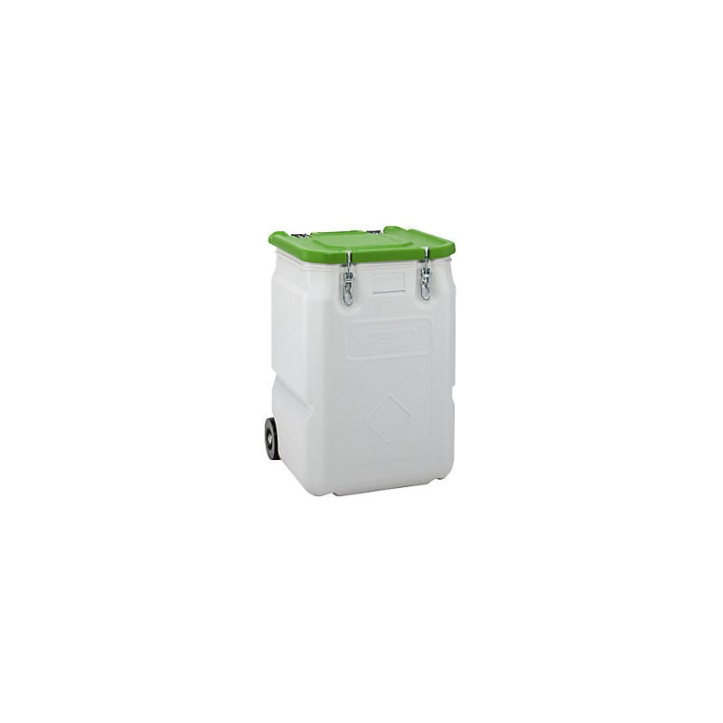 Contenitore per la raccolta di sostanze pericolose Mobil-Box, capacità 250 l, lungh. x largh. x alt. 600 x 600 x 890 mm, verde. Capacità = 250 l. Lunghezza = 600 mm. Larghezza = 600 mm. Altezza = 890 mm. Peso = 15 kg. Colore = grigio. Numero maniglie = 1 pz. Materiale = polietilene (a bassa densità PE / LDPE). Caratteristiche = impilabile. Coperchio = sì. Colore coperchio = verde. Per sostanze = prodotti assorbenti per oli, residui di vernice, panni per pulizia. Luogo d'impiego = per interni ed esterni. Tipo di prodotto = contenitori per sostanze pericolose. Contenitore per la raccolta e il magazzinaggio di prodotti assorbenti usati, panni di pulizia, residui di vernici ecc. Coperchio richiudibile sottovuoto con chiusure a staffa e coppiglie di sicurezza. Mobili grazie a 2 rotelle e impugnatura integrata. Contenitori per la raccolta di sostanze pericolose MOBIL-BOX, con 2 ruote e coperchio colorato. Impilabili, possono essere svuotati con un carrello elevatore con colonna girevole.