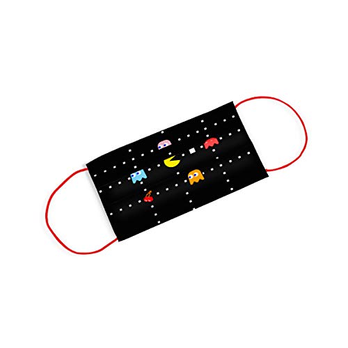 Maschera Comecocos su fondo nero . Maschera retrò per gli amanti dei videogiochi. Elastici rossi in contrasto