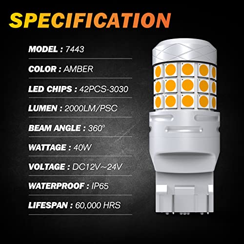 【Ampia applicazione】 la lampadina per auto 7443 w21 / 5w compatibile con indicatori di direzione, luci posteriori, luci di parcheggio, luci di posizione laterali, lampadine di marcia diurna ecc. 7444NA 7443-SCK 7443-SRCK 7444LL W21/5W WY21W ecc. Potrebbe essere necessario un resistore di carico aggiuntivo o un relè flash per prevenire il codice di errore o il problema dell'iper flash durante la sostituzione degli indicatori di direzione.