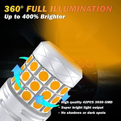 【Illuminazione ultra luminosa e a 360 gradi】 potenza di lavoro della lampadina per auto da 580 w21 / 5w: 40 W, emissione luminosa: 2000 lm, tensione: 12-24 V. La lampadina a led ambra 580 w21 / 5w 7443 con chip 3030 da 42 pezzi super luminosi, emissione luminosa di illuminazione ad angolo completo a 360 gradi, oltre il 400% più luminosa della lampadina alogena originale.