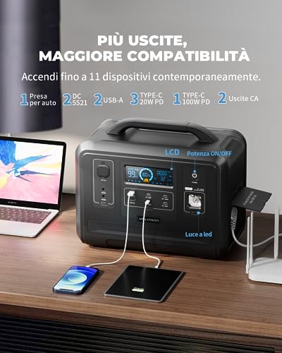 【PIÙ PRESE, MAGGIORE COMPATIBILITÀ】 Il generatore di corrente con 11 diverse uscite può alimentare fino a 11 dispositivi contemporaneamente. 2 prese AC PURE SINE WAVE da 230 V/2000 W, 1 presa accendisigari per auto, 2 x DC5521, 3 x 20 W tipo C PD, 1 x 100 W tipo C PD, 2 x USB A. Perfettamente compatibile con forno a microonde, cuociriso, aria condizionatore, asciugatrice domestica, bollitore elettrico, asciugacapelli, lampada da campeggio, computer portatile, telefono e così via.
