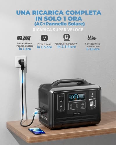【UNA CARICA COMPLETA IN SOLO 1 ORA】VDL HS1200 Centrale elettrica portatile dotata di un inverter a due vie integrato, viene realizzata una ricarica rapida di 700W CA. Non è più necessario un adattatore pesante! La capacità di 960 Wh può essere caricata completamente in 1 ora combinando la presa a muro CA con il pannello solare (400W). La centrale elettrica può anche essere caricata in modo efficiente ovunque con adattatore CA, pannello solare, caricabatteria per auto.