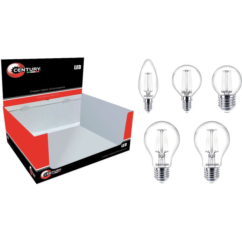 Century espositore lampade a filamento led magic box 4.000k luce naturale 32 pz. Lampade in vetro trasparente, innovativo led a filamento bianco, vita 15.000 ore, grado di protezione IP20. Composizione: 8 pezzi mod. Candela 4,5 W - E14, 7 pezzi mod. Sfera 4,5 W - E14, 7 pezzi mod. Sfera 4,5 W - E27, 5 pezzi mod. Goccia 7,5 W - E27, 5 pezzi mod. Goccia 8 W - E27. Articolo produttore: MAGIC BOX (NATURALE)