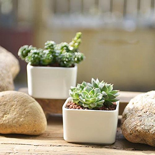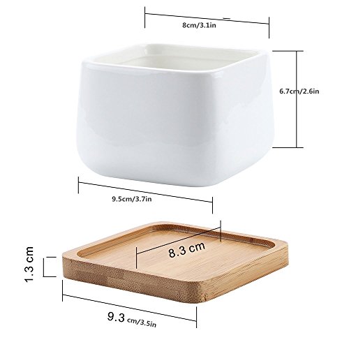Ceramica Vaso sucuulent vasi - Bianco Cactus Vaso per piante con vassoio in bambù 9.5cm Set di 2
