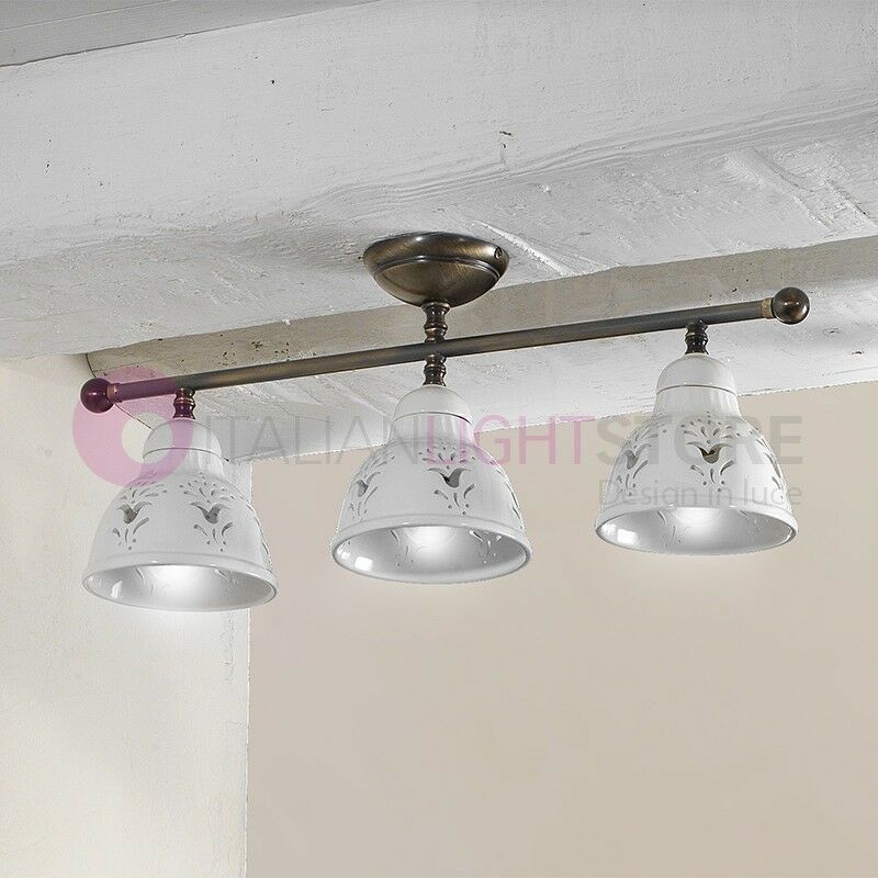 Lampadario da soffitto a 3 luci, con diffusore in ceramica bianca traforata e struttura in ottone. Plafoniera lampadario da soffitto a 3 luci realizzato in ottone con diffusori in ceramica bianca lucida traforata, in stile classico rustico country, collezione Masseria di Ceramiche Borso . La lampada si compone da una struttura allungata realizzata in ottone, finitura anticata spazzolata, alla quale vengono abbianati eleganti diffusori in ceramica bianca lucida, impreziositi da una particolare lavorazione floreare traforata. Ideale per illuminare soggiorni e cucine dal design rustico e country. La collezione di lampadari in ceramica Masseria è ispirata al passato e ripropone materiali classici come ceramica e ottone, sapientemente lavorati da artigiani secondo antiche tradizioni.Comprende il saliscendi, le lampade a sospensione e a plafoniera, le appliques a parete, i bilanceri e le lampade da tavolo (VEDI CORRELATI). Produzione 100% Made in Italy. Dimensioni: diffusore coppetta D.