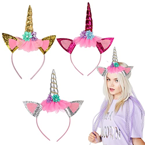 Cerchietti Unicorno Bambina, Cerchietto con Corno di Unicorno, Fasce Unicorno Ragazze, Cerchietto Unicorno con Fiori, Plastica Hairbands Con Orecchie, per Pasqua Compleanni Feste Cosplay, 3 Pezzi (B)