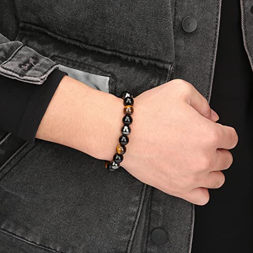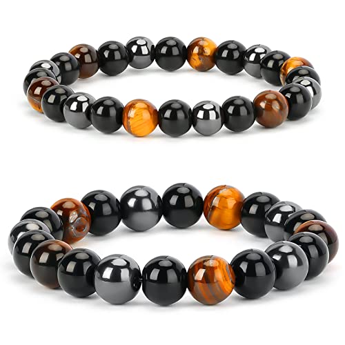 CERISIAANN Bracciale con tripla protezione, 2 pezzi di ossidiana nera occhio di tigre pietra ematite braccialetto naturale occhio di tigre braccialetto buona fortuna regalo per lui fidanzato marito padre, 16 centimeters, Pietra
